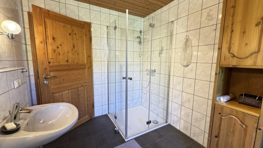 Das Bad verfügt über Tageslicht und bietet außerdem 2 Waschbecken, eine Dusche und einen