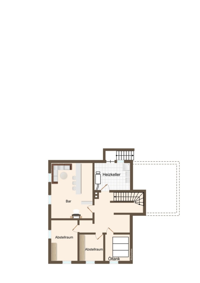 Im Untergeschoss stehen vielfältige Möglichkeiten zur Verfügung: ein Heizungsraum mit Öltank, eine Werkstatt, ein Hobbykeller mit Bar sowie weitere Abstellflächen. Ein besonderes Highlight ist die unterkellerte Terrasse, die ideale Bedingungen zur Lagerung von Lebensmitteln bietet. Eine Garage mit angrenzender Werkstatt von rund 20 m² und zusätzlichem Abstellraum im Dachgeschoss ergänzt das Raumangebot perfekt.