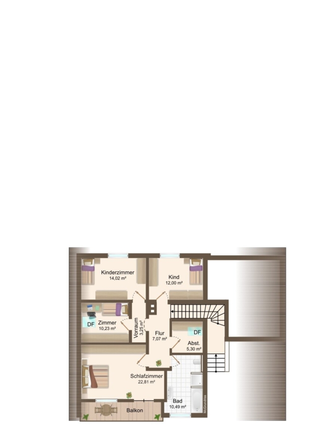 Das Obergeschoss überzeugt mit einem besonders gelungenen Grundriss. Drei geräumige Kinderzimmer bieten viel Platz und flexible Nutzungsmöglichkeiten. Aktuell wird eines davon als Elternschlafzimmer genutzt, ein weiteres als großzügige Ankleide. Hinzu kommt ein über 22 m² großes Schlafzimmer mit Zugang zum Balkon, ein komfortables Badezimmer mit Badewanne, Dusche, WC und zwei einzelnen Waschbecken sowie ein praktischer Abstellraum. Fußbodenheizung, hochwertige Laminat- und Fliesenböden runden den Wohnkomfort ab.