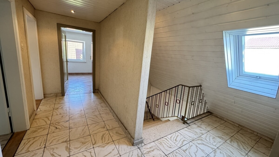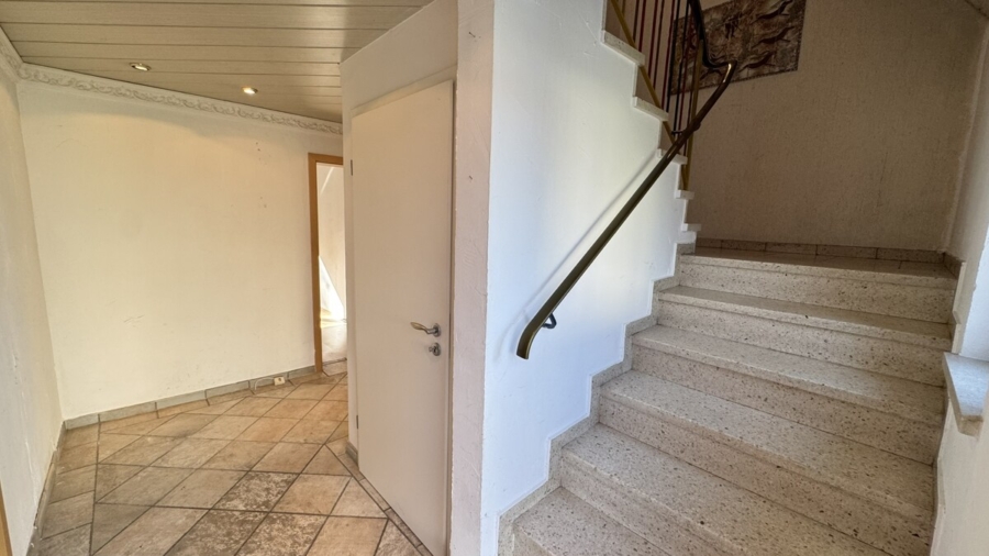 Über eine massive Betontreppe gelangt man in das Obergeschoss. Dort befinden sich drei