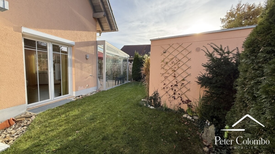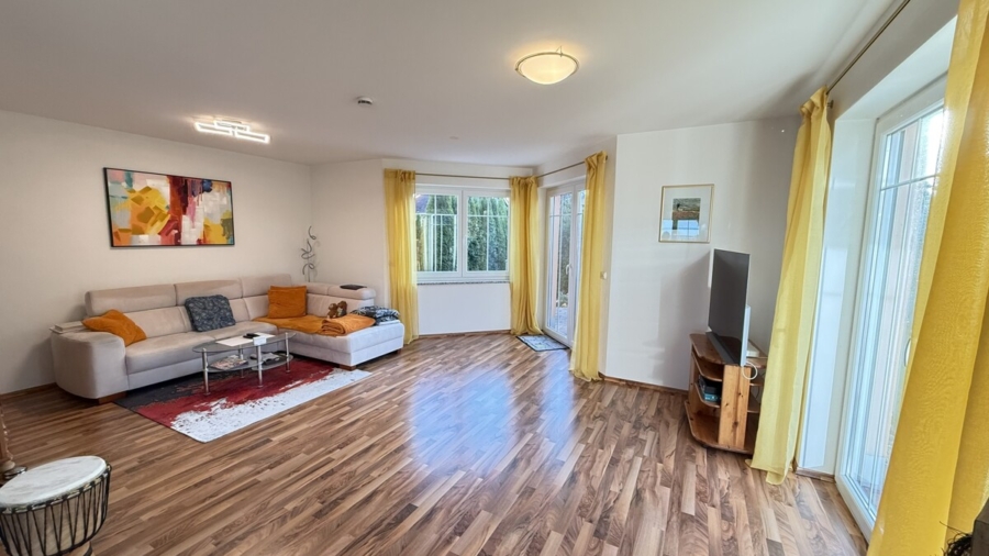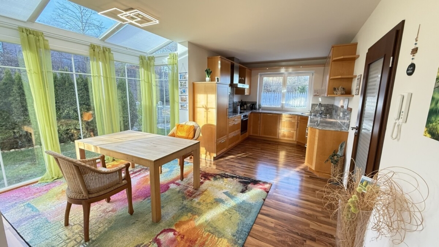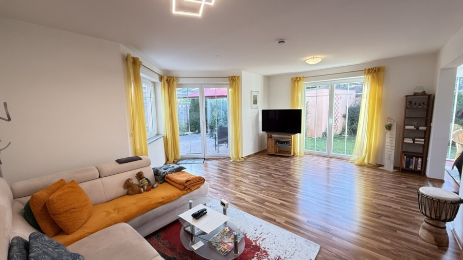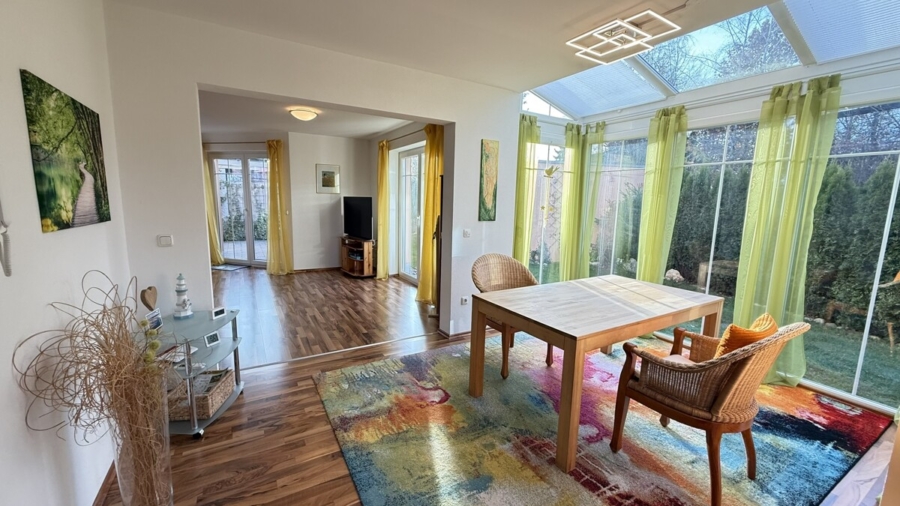 Das Wohnzimmer selbst ist großzügig gestaltet, verfügt über einen Anschluss für einen Schwedenofen und bietet direkten Zugang zur großzügigen Terrasse mit Glasdach und Glasschiebetüren, die einen geschützten Übergang in den Garten schafft.