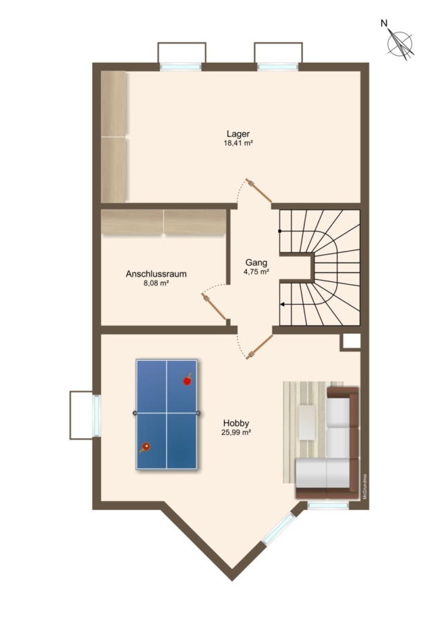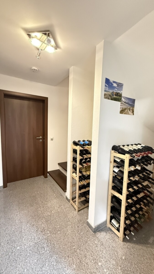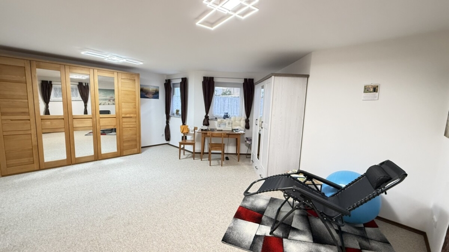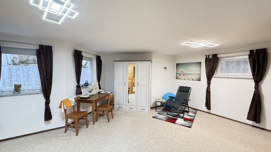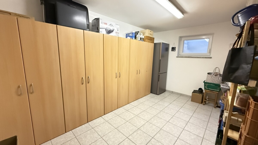 Im Kellergeschoss befindet sich ein großer Hobbyraum mit Lichthof, der ebenfalls über Fußbodenheizung verfügt, ideal für Homeoffice, Fitness oder als Spielbereich. Ergänzt wird der Keller durch einen separaten Abstellraum mit Zugang zum Technikraum sowie eine geräumige Waschküche.