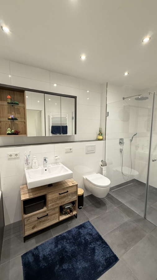 Das moderne Badezimmer ist mit einer großen bodenebenen, barrierefreien Dusche sowie einer Badewanne ausgestattet. Ergänzt wird das Raumangebot durch ein separates, hochwertig ausgestattetes Gäste-WC. Fußbodenheizung in allen Räumen, elektrische Rollläden sowie dreifach isolierverglaste Fenster sorgen für hohen Wohnkomfort und ein angenehmes Raumklima.