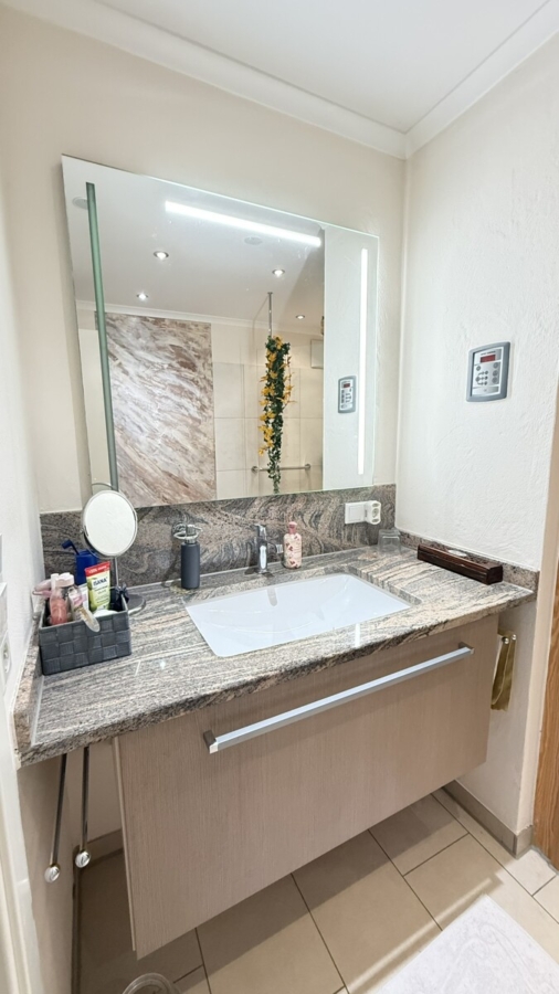 Das neuwertige Badezimmer ist modern gestaltet und verfügt über eine große Dusche sowie eine integrierte Infrarotsauna, die für zusätzlichen Komfort und Entspannung sorgt. Das separate WC befindet sich im Flur direkt neben dem Badezimmer.