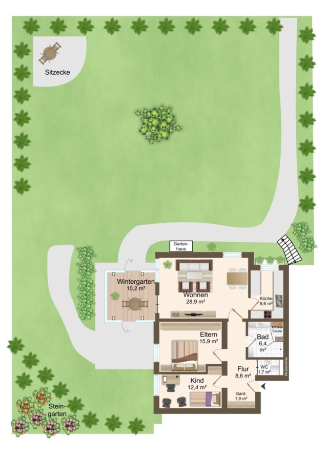 außergewöhnlich große Gartenfläche mit ca. 143 m² und eingewachsener Bepflanzung