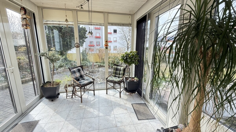 Wintergarten aus Glas mit Raffstore, zwei Türen und direktem Zugang zum Garten