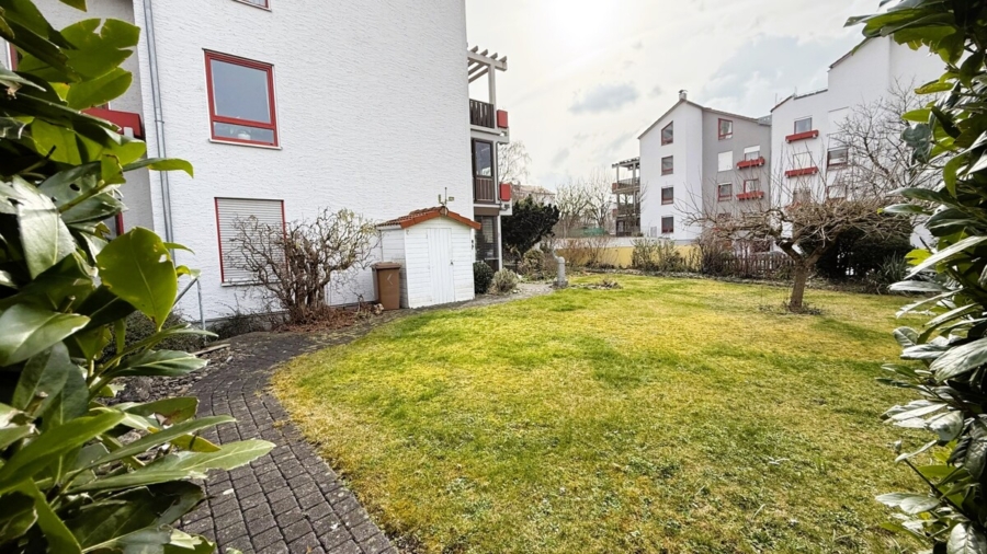 Angrenzend befindet sich ein heller Wintergarten aus Glas, der mit zwei Türen ausgestattet ist und einen direkten Zugang zum Garten ermöglicht. Der ca. 143 m² große Garten ist außergewöhnlich großzügig für eine Erdgeschosswohnung und bietet durch seine eingewachsene Bepflanzung viel Privatsphäre. Auf dem Grundstück befindet sich zudem ein kleines Gartenhaus, das zusätzlichen Stauraum für Gartengeräte oder Freizeitutensilien bietet. Besonders praktisch ist der direkte Zugang vom Garten in den Kellerbereich.