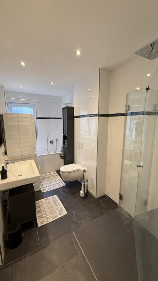 Modernes Bad mit bodenebener Dusche und Badewanne, WC und Waschmaschinenanschluss