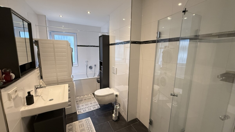 Das moderne Badezimmer ist hochwertig ausgestattet und verfügt über eine Badewanne, eine Dusche, ein WC sowie einen Waschmaschinenanschluss.