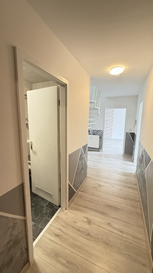 Über eine elegante Wendeltreppe in der Diele gelangen Sie in das Obergeschoss. Hier erwarten Sie zwei weitere gut geschnittene Zimmer sowie ein zusätzliches Badezimmer, ausgestattet mit Badewanne, Waschbecken und WC.