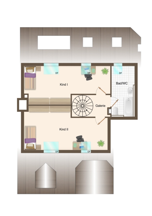 Ebenfalls von der Diele aus erreichen Sie den weitläufigen Wohnbereich mit Zugang zur Dachloggia, die zum Entspannen im Freien einlädt. Angrenzend befindet sich ein weiteres Zimmer, das sich ideal als Elternschlafzimmer oder Büro nutzen lässt.
